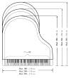 Sizes and Types: The standard width of a grand piano is also about 5'. The length varies from 4˝' to 9˝'. The total floor space allowance for the smallest grand should be at least 5' wide by 6˝' long, including bench space. Grand pianos are measure by the length from the very front of the keyboard to the farthest end of the piano along the spine, with the lid closed. The smallest Steinway is 5 ft. 1 in. (The size stated is always the over-all length of an instrument.) There are several types of grand pianos, based on piano length. Click on image for example of size and specifications: