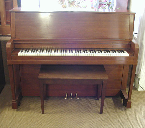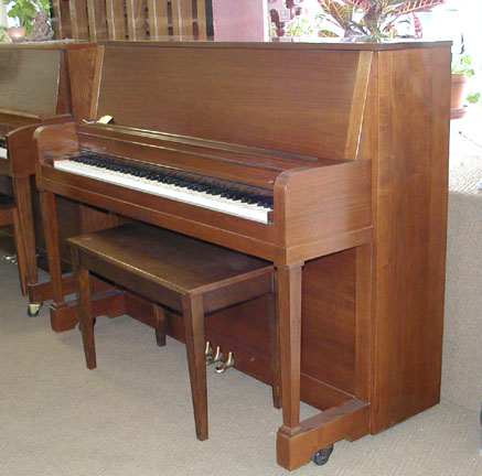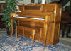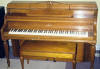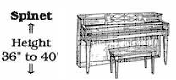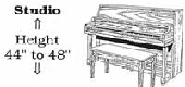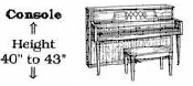 Sizes and Types - The standard width of an upright piano is about 5' and the depth is between 2 - 2˝'. The total floor space allowance should be about 5' wide by 5' deep, including bench space. The height of the piano makes no difference in the floor space needed but it makes a major difference in the quality of sound the piano produces. The height of a vertical piano is measured from the floor to the top of the piano. There are four types of vertical pianos, based on piano height: Spinet, Console, Studio, and Upright. The size is measured from the floor to the top of the lid. The spinet piano measures less than 36" tall. The console measures 40 to 44" tall. The studio or "professional upright" measures 45 to 50" tall. The largest of the vertical pianos is the upright, which measures over 50" tall.