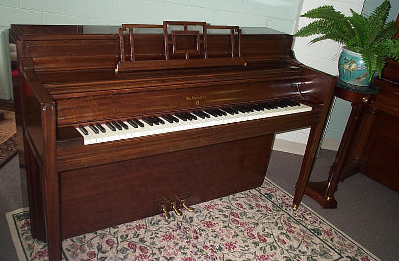 A craze for very small size also afflicted Upright pianos. With the result that miniature models appeared which could only be classed as toys. The height was reduced by lowering the position of the action in relation to the keyboard, so that the lever was pulled up by the key instead of being lifted in the normal way. This type of piano sold as a “Spinet”. When compared with the small Grand pianos condemned in the previous paragraph, these miniature Uprights sink to about the same depth of tonal and acoustic banality. I can appreciate the demand for small pianos for small rooms, and in small orchestras where space is limited and the player must be able to see the leader, but I cannot see the sense of mutilating the tone and touch of a piano merely to reduce the height by a further three or four inches.